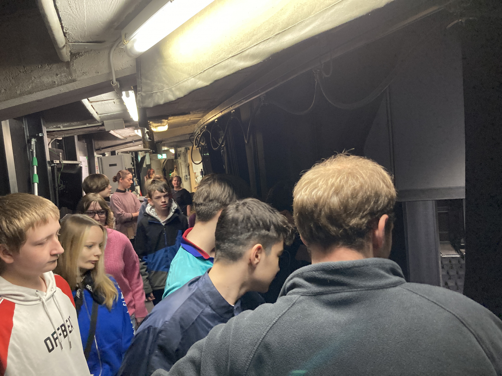 Klasse 7a und 7b haben gemeinsam das Stadttheater Münster besucht. Zunächst hat Bühnentechniker Robert Figgen uns eine eindrucksvolle Führung hinter die Kulissen gewährt. Wir durften auf und hinter der Bühne des großen Hauses stehen, Requisiten aus nächster Nähe betrachten und ganz nach oben auf den Schnürboden klettern, den höchsten Teil des Bühnenhauses. Anschließend haben wir uns das inspirierende und gleichzeitig lustige Stück „Und alles“ angesehen. Das Theaterstück erzählt die Geschichte von Ehsan, der vor den Schrecken der Welt in einen Bunker flüchtet, weil ihm Klimakrise, Krieg und Machtgier zu viel werden. Seine Freunde versuchen mit Fantasie, Witz und Hoffnung, ihn wieder ins Leben zurückzuholen.